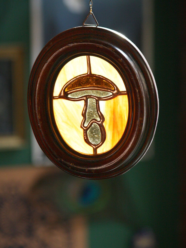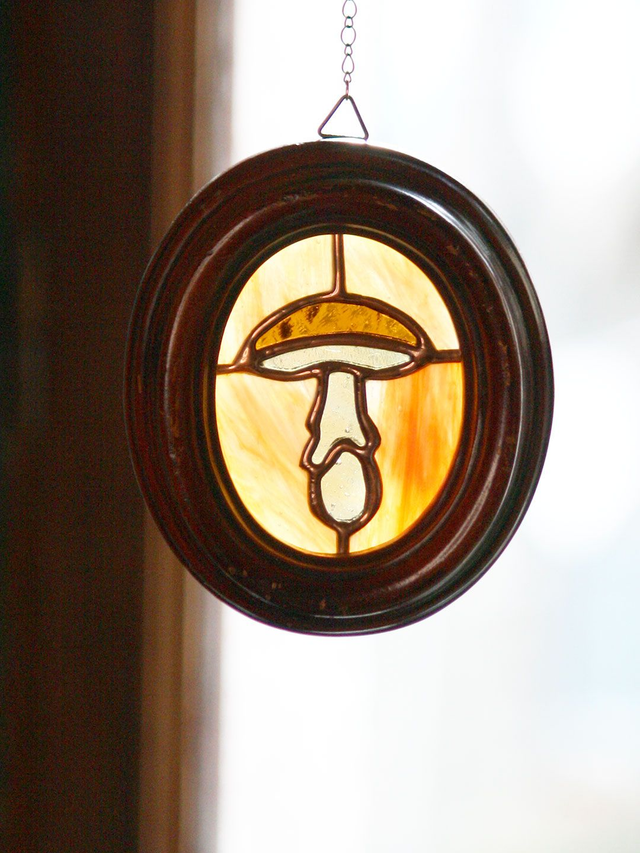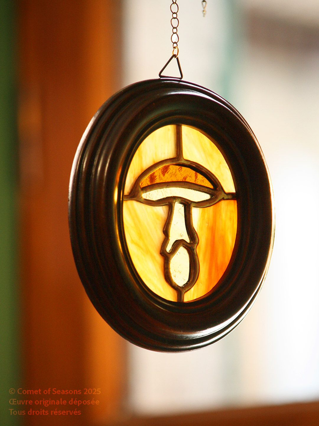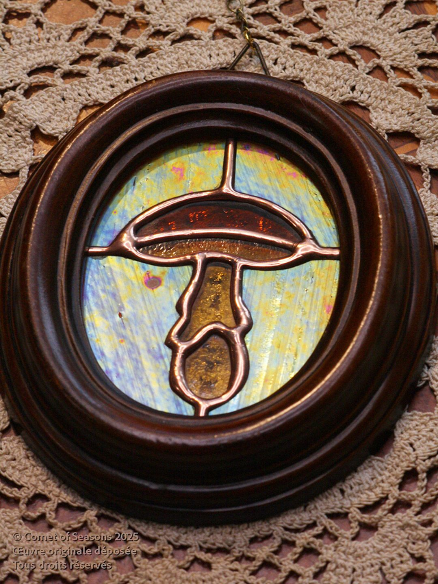 Verre irrité orange pour le fond, l'ensemble a été patiné en cuivre.