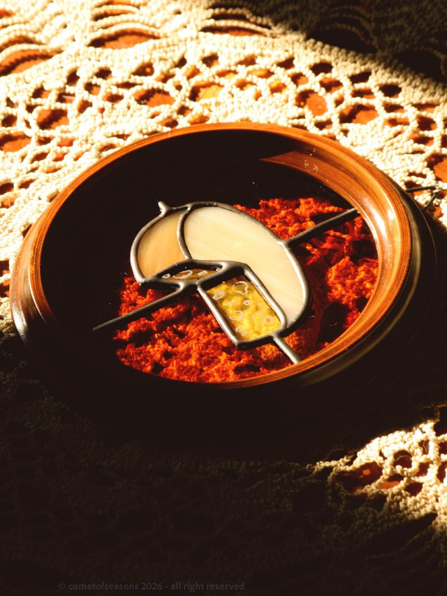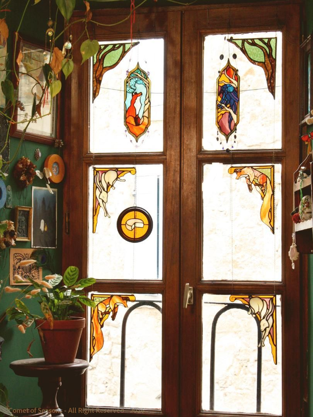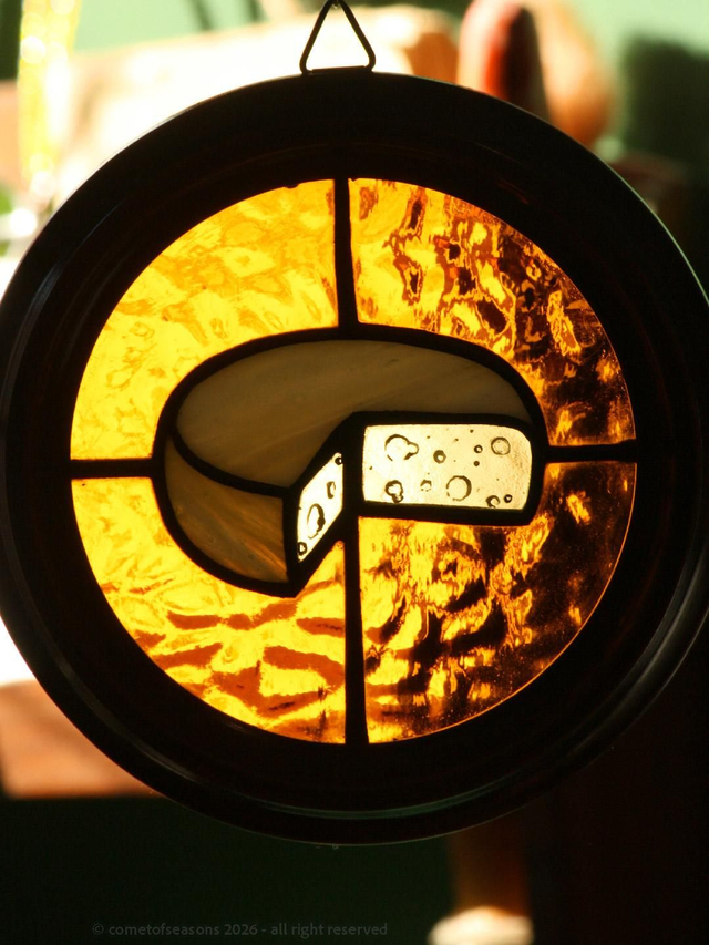 Vitrail gourmand : un le fromage tant désiré, peint à la main puis cuit au four, installé bien au chaud dans un cadre en résine imitation bois chiné. Ambiance cottage assurée, comme un fragment de cuisine de conte où l’on devine déjà le corbeau vexé et le renard trop fier de lui. Le verre ambré capte la lumière et fait briller le fromage comme une relique sacrée (celle qui n’aurait jamais dû tomber). Assemblage technique Tiffany, finitions patinées en noir.