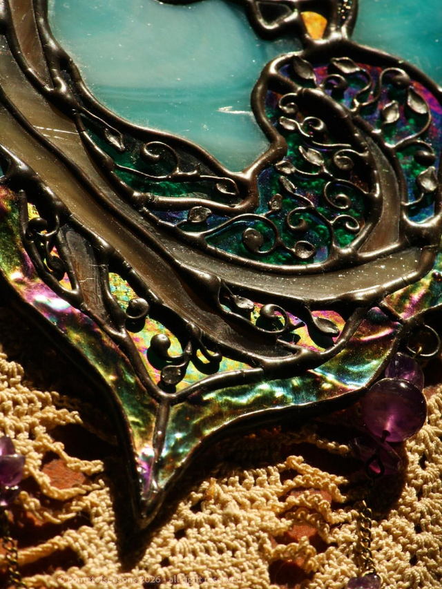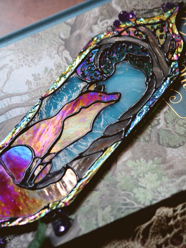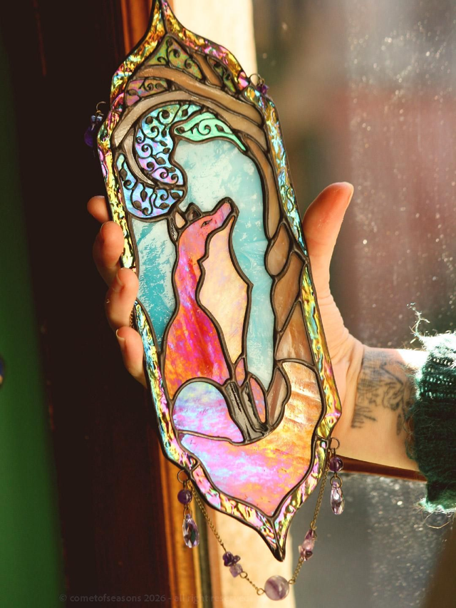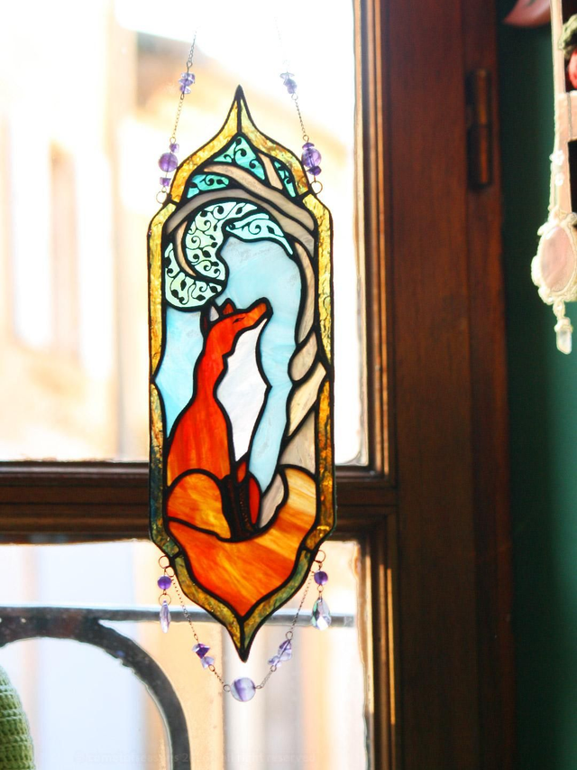 Vitrail représentant le fameux renard… celui qui patiente l’air de rien, déjà très fier de son mauvais coup à venir. Clin d’œil direct aux Fables de La Fontaine, version filou assumé. Le corps est en verre orange irisé, chaud et lumineux, la partie ambre est elle aussi irisée. Le feuillage de l’arbre a été travaillé à la main avec de fins fils de cuivre posés sur un verre turquoise irisé, pour un effet délicat et vivant. Assemblage technique Tiffany, soudures patinées en noir.
