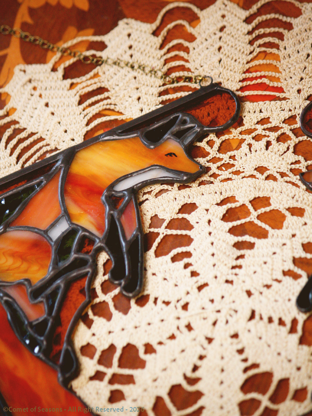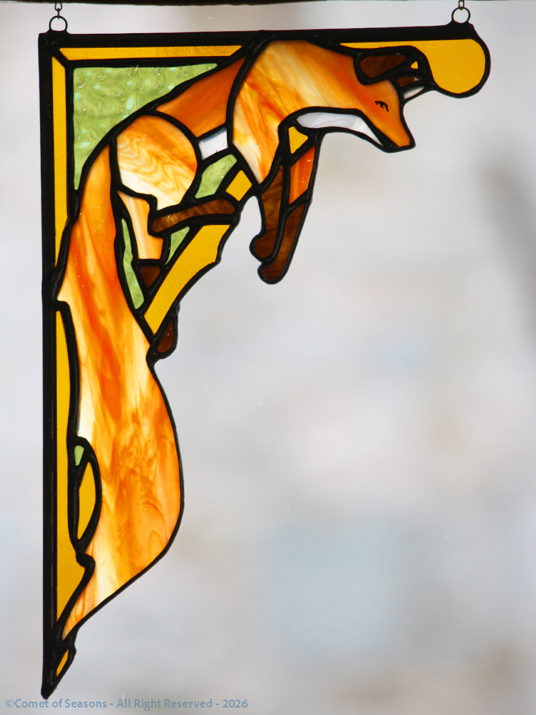 Angle de fenêtre en vitrail inspiré des Fables de La Fontaine. Ce renard aux couleurs de braise s’accroche au coin du jour, malicieux et tranquille, comme s’il observait le monde depuis son perchoir. Le visage est peint à la main, chaque pièce est unique. Le verre orange enflammé donne au pelage une profondeur chaude et vivante, soulignée par des soudures patinées en noir selon la technique Tiffany.