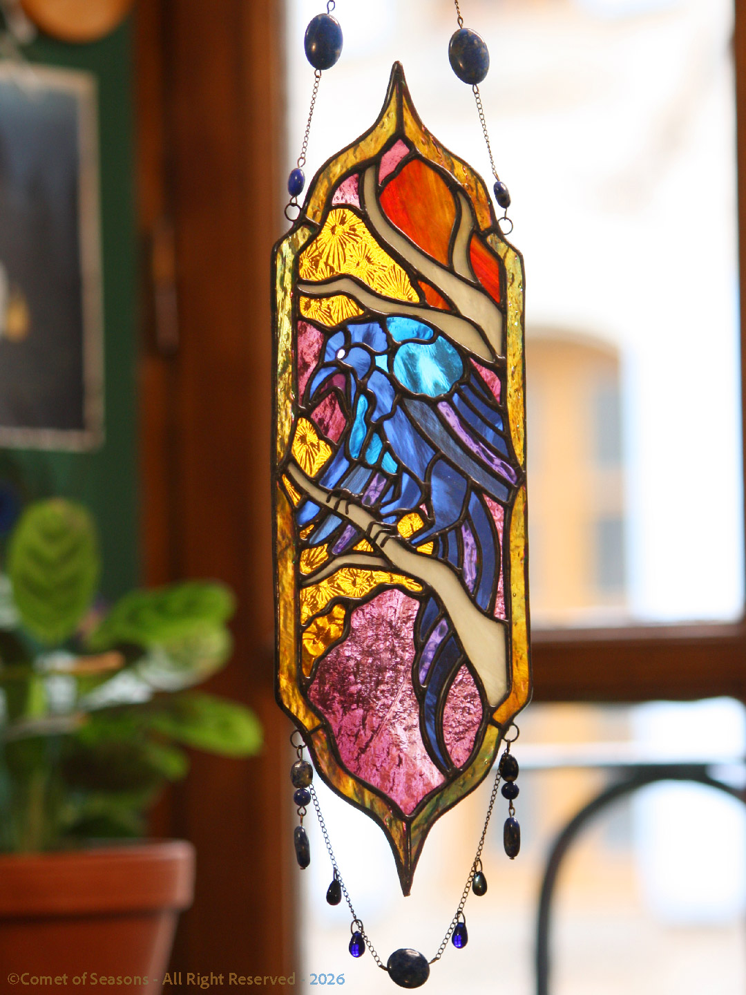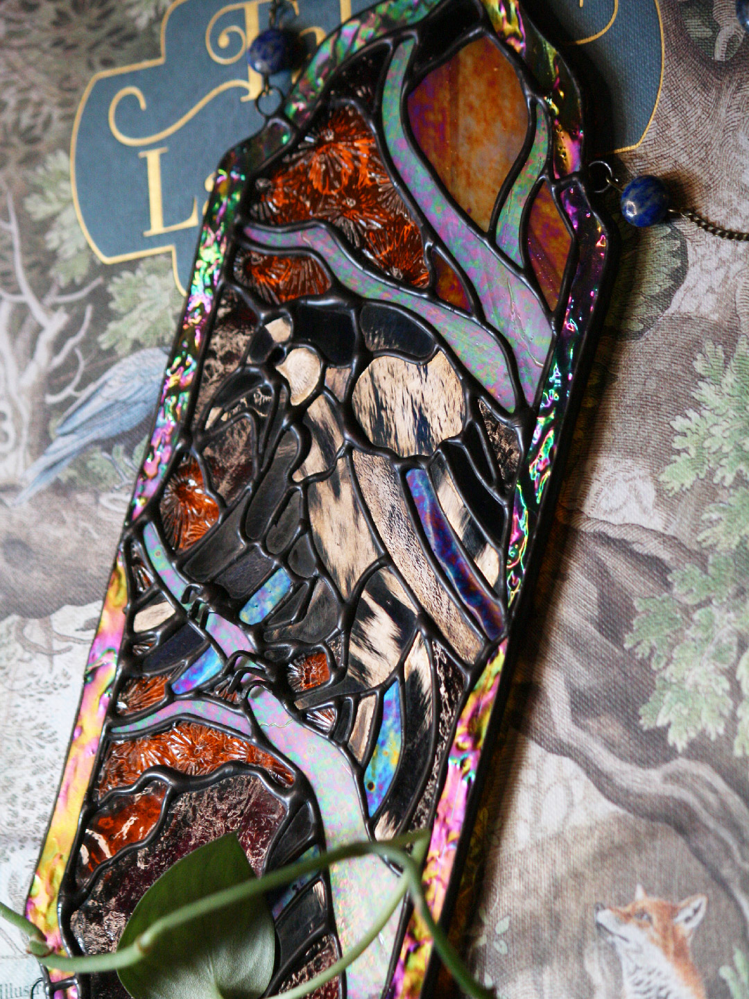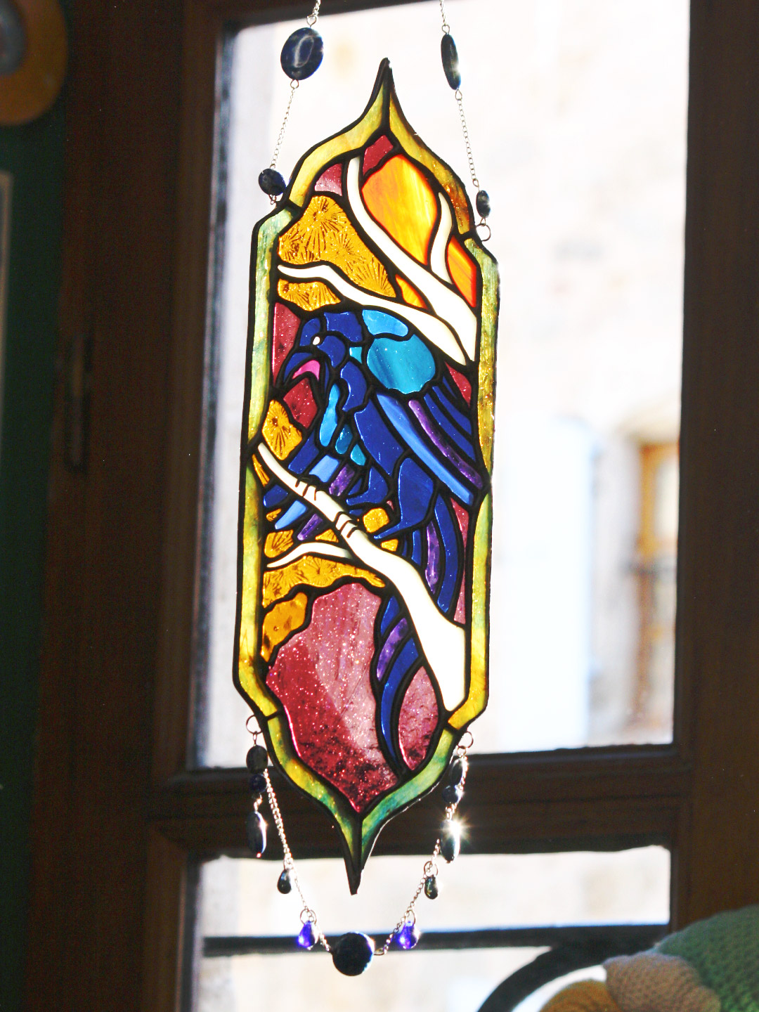 Vitrail représentant un corbeau un peu boudeur, juste après le drame : le fromage a glissé, et le renard s’en est allé trop content de son coup. Un clin d’œil direct aux Fables de La Fontaine, version mauvaise humeur assumée. Le cadre est en verre irisé, certaines plumes aussi, pour des reflets changeants du bleu au violet. Assemblé selon la technique Tiffany, soudures patinées en noir.